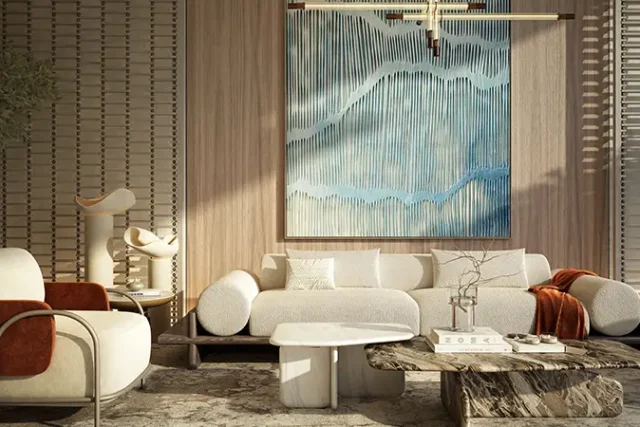 • Iconic sand-toned architecture with curved balconies, blending modern design with coastal elegance and a soft, natural colour palette.